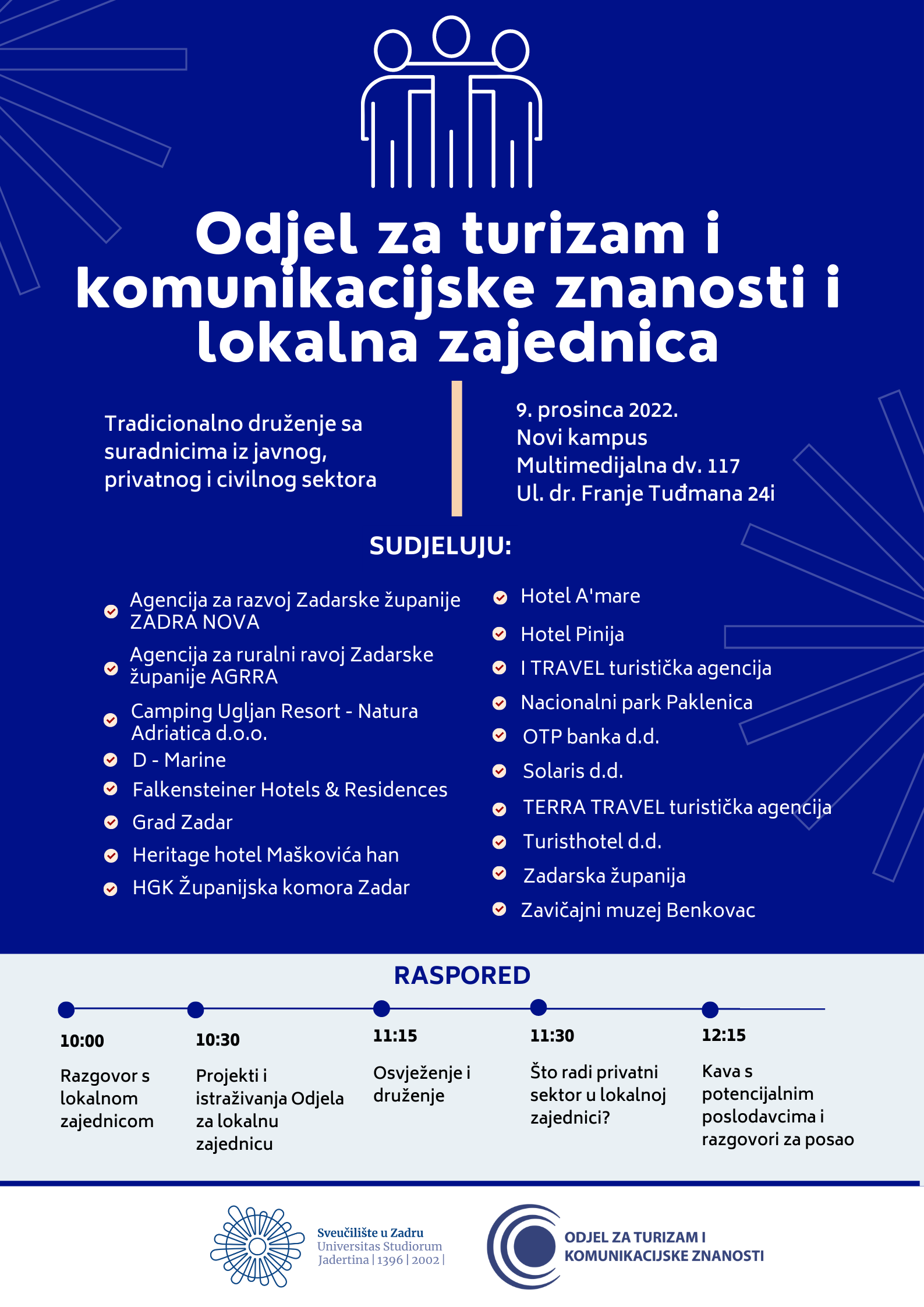 U petak, 9. prosinca 2022., s početkom u 10:00 sati, Odjel za turizam i komunikacijske znanosti Sveučilišta u Zadru organizira tradicionalni susret sa suradnicima iz javnog, privatnog i civilnog sektora.